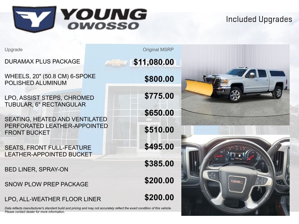 LOCAL TRADE!, Sierra 2500HD SLT, 4D Crew Cab, Duramax 6.6L V8 Turbodiesel, Allison 1000 6-Speed Automatic, 4WD, 110-Volt AC Power Outlet, 220 Amps Alternator, 4.2" Diagonal Color Display Driver Info Center, Auto-Dimming Inside Rear-View Mirror, Bluetooth® For Phone, Bose 6 Speaker Sound System, Chrome Bodyside Moldings, Chrome Door Handles, Chrome Mirror Caps, Chrome Power-Adjustable Heated Outside Mirrors, Color-Keyed Carpeted Floor Mats, Color-Keyed Carpeting Floor Covering, Deep-Tinted Glass, Digital Steering Assist, Driver & Front Passenger Vanity Mirror Visors, Dual-Zone Automatic Climate Control, Duramax Plus Package, Electric Rear-Window Defogger, Electronic Shift Transfer Case, EZ-Lift & Lower Tailgate, Front Halogen Fog Lamps, GMC 4G LTE, GMC Connected Access, HD Radio, Heated Power-Adjustable Outside Mirrors, Heavy-Duty Handling/Trailering Suspension Package, Leather-Wrapped Steering Wheel, LED Cargo Box Lighting, Manual Tilt-Wheel/Telescoping Steering Column, OnStar & GMC Connected Services Capable, Power Windows w/Driver Express Up & Down, Power-Adjustable Pedals For Accelerator & Brake, Preferred Equipment Group 4SA, Provision for Cab Roof-Mounted Lamp/Beacon, Radio: AM/FM/SiriusXM/HD w/Navigation, Rear 60/40 Folding Bench Seat (Folds Up), Rear Wheelhouse Liners, Remote Keyless Entry, Remote Locking Tailgate, Remote Vehicle Starter System, Single Slot CD/MP3 Player, SiriusXM Satellite Radio, Snow Plow Prep Package, Steering Wheel Audio Controls, Theft Deterrent System (Unauthorized Entry), Trailer Brake Controller, Trailering Equipment, Ultrasonic Front & Rear Park Assist, Universal Home Remote.