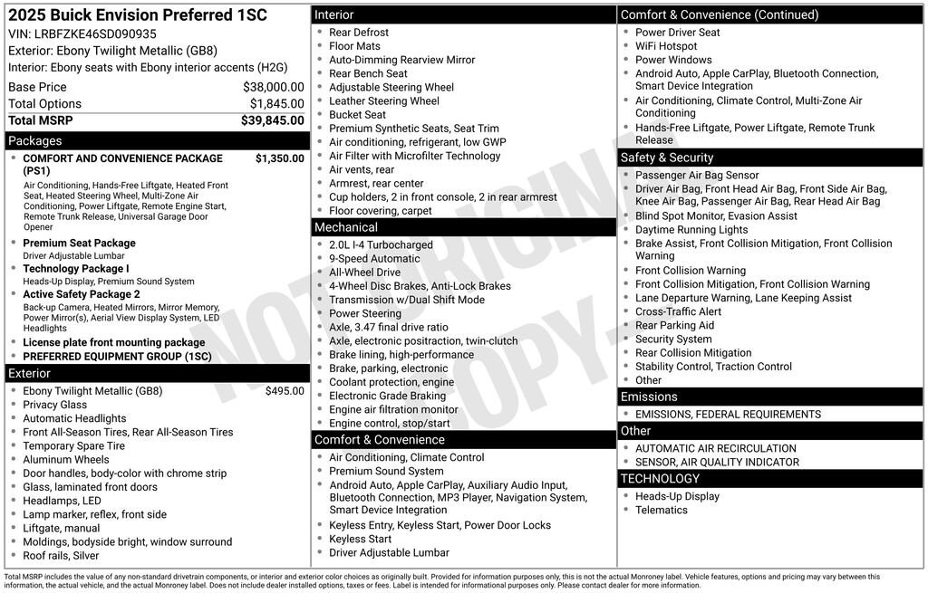 Ebony Twilight Metallic 2025 Buick Envision Preferred AWD 9-Speed Automatic 2.0L Turbocharged22/28 City/Highway MPG