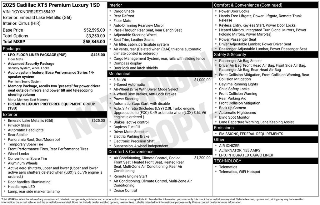 Emerald Lake Metallic 2025 Cadillac XT5 Premium Luxury AWD 9-Speed Automatic 3.6L V6 DI VVT