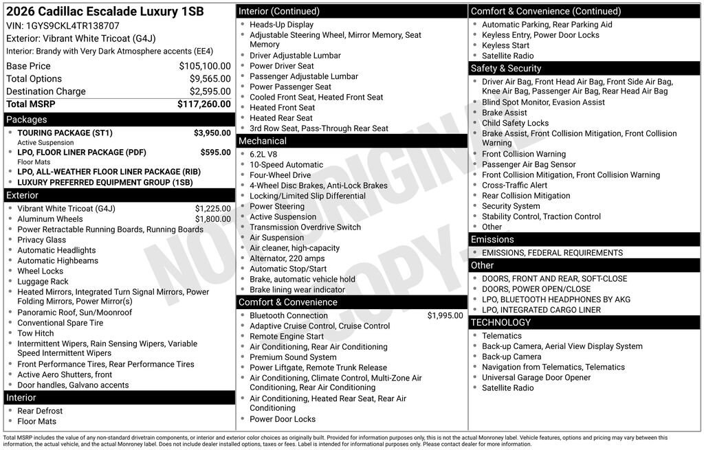 Vibrant White Tricoat 2026 Cadillac Escalade Luxury 4WD 10-Speed Automatic with Overdrive 6.2L V8 4WD, Brandy With Very Dark Atmosphere Accents Leather.