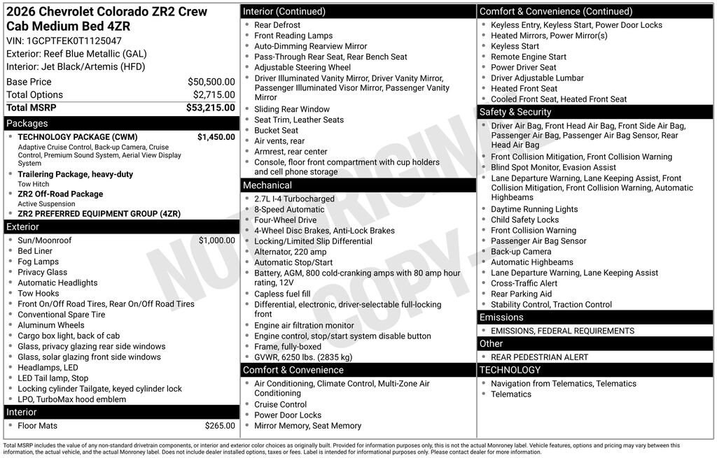 Reef Blue Metallic 2026 Chevrolet Colorado ZR2 4WD 8-Speed Automatic 2.7L I4 Turbocharged DOHC 16V LEV3-ULEV50 310hp 4WD.