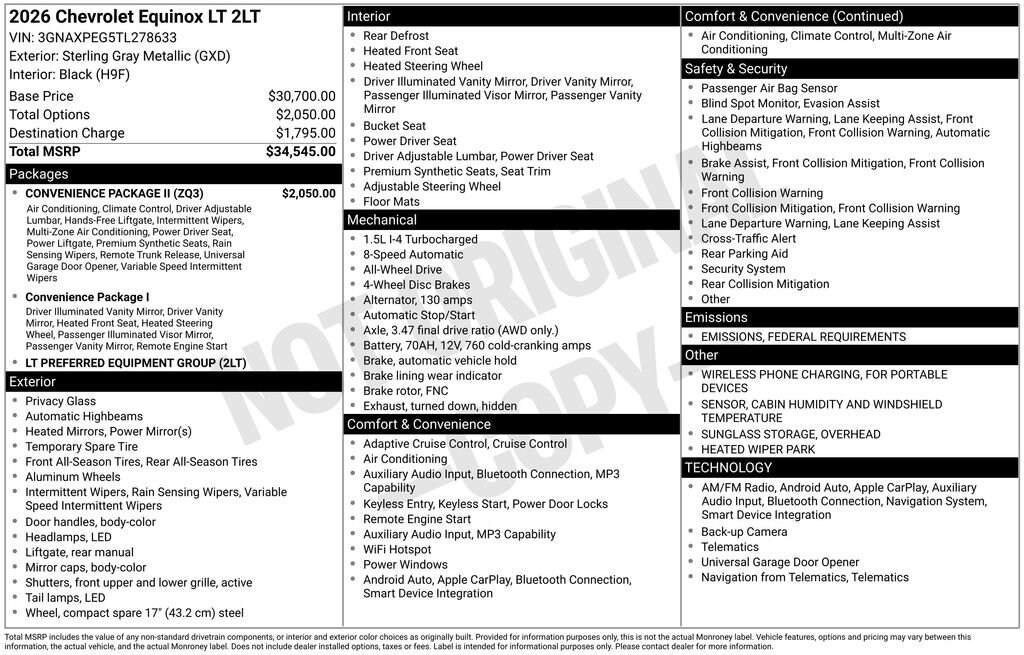 Sterling Gray Metallic 2026 Chevrolet Equinox LT AWD 8-Speed Automatic 1.5L DOHC AWD.Recent Arrival! 24/29 City/Highway MPG