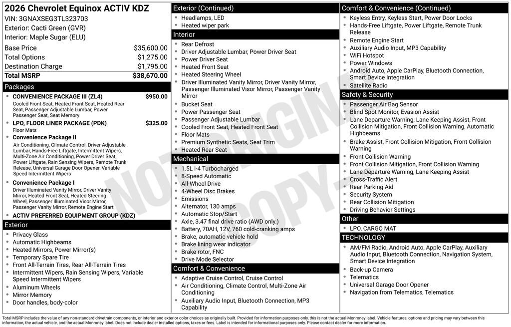 Green 2026 Chevrolet Equinox ACTIV AWD 8-Speed Automatic 1.5L DOHC AWD.Recent Arrival! 24/29 City/Highway MPG