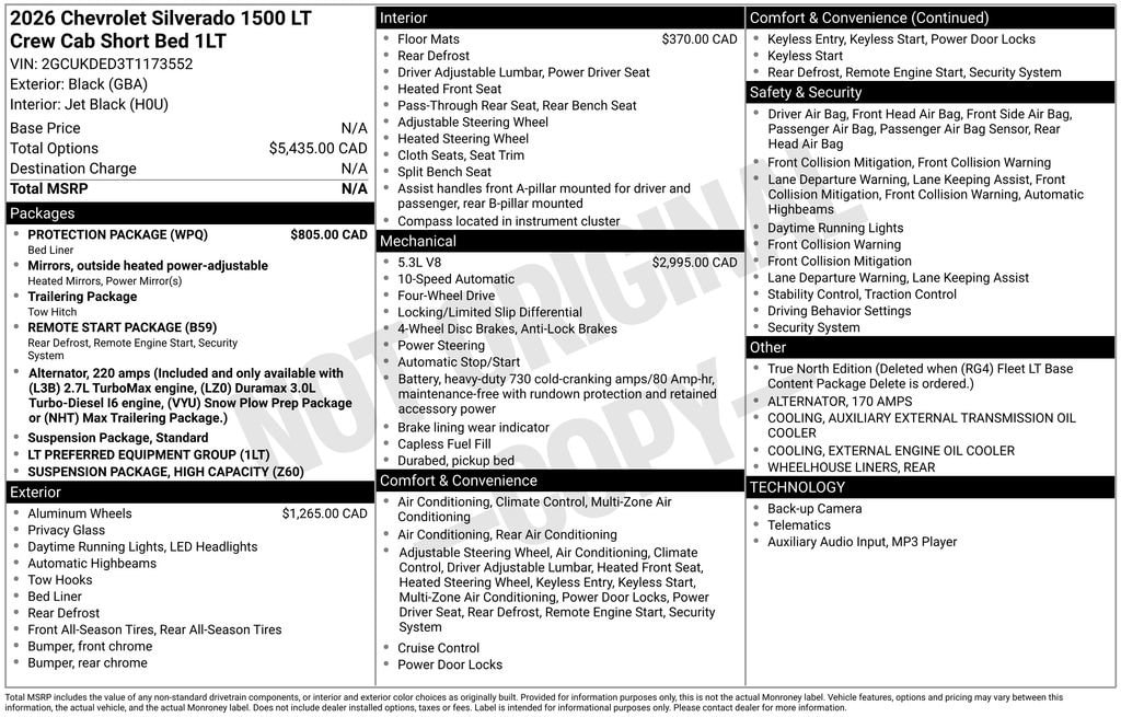 Black 2026 Chevrolet Silverado 1500 LT LT1 4WD 10-Speed Automatic EcoTec3 5.3L V8 10-Speed Automatic, 4WD, Jet Black Cloth.