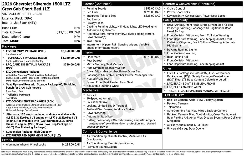 Black 2026 Chevrolet Silverado 1500 LTZ 4WD 10-Speed Automatic EcoTec3 5.3L V8 10-Speed Automatic, 4WD, Jet Black Leather.