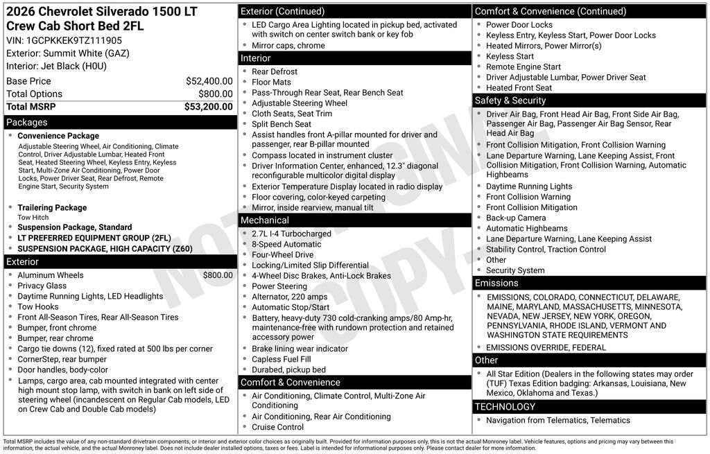 Summit White 2026 Chevrolet Silverado 1500 LT 4WD 8-Speed Automatic 2.7L I4 Turbocharged DOHC 16V LEV3-SULEV30 310hp 8-Speed Automatic, 4WD, Black Cloth.Recent Arrival!
