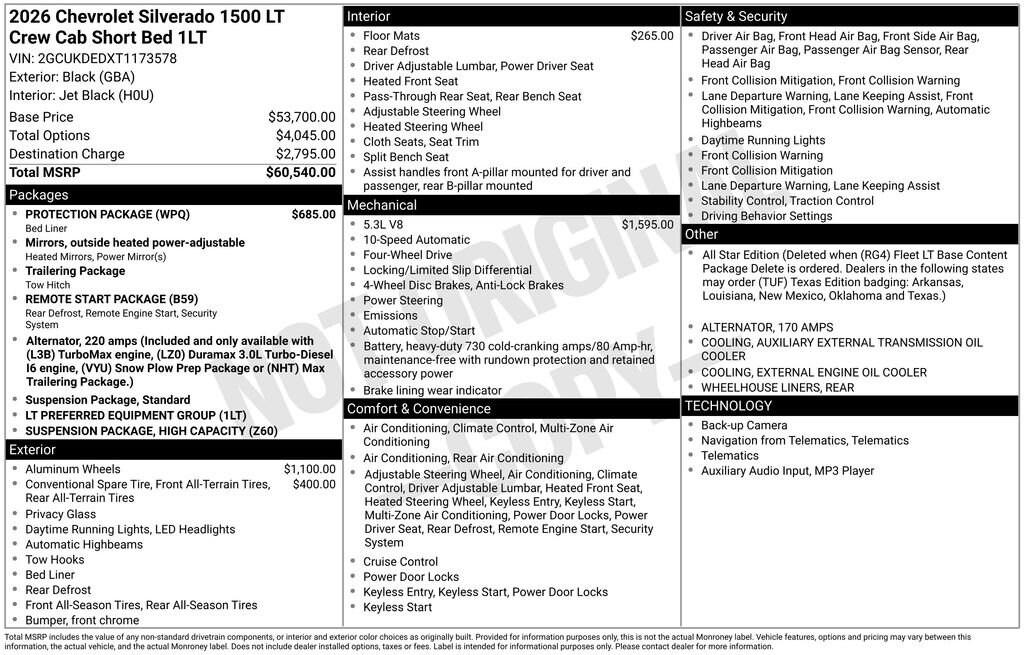 Black 2026 Chevrolet Silverado 1500 LT LT1 4WD 10-Speed Automatic EcoTec3 5.3L V8 10-Speed Automatic, 4WD, Jet Black Cloth.