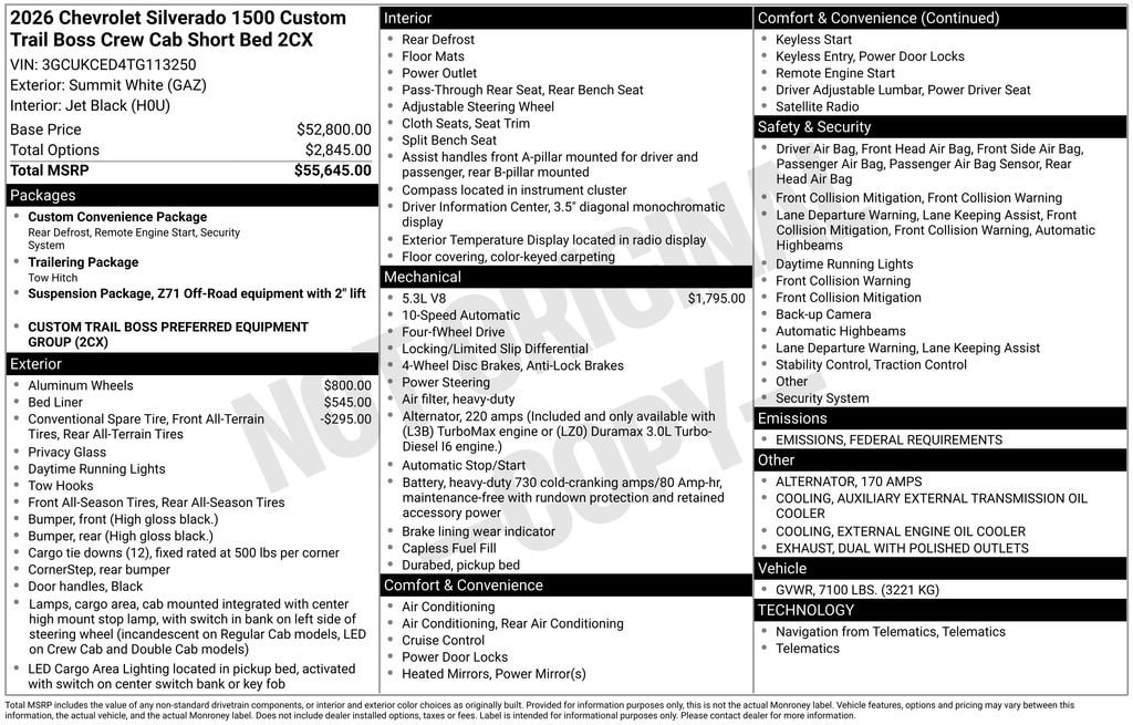 Summit White 2026 Chevrolet Silverado 1500 Custom Trail Boss 4WD 10-Speed Automatic EcoTec3 5.3L V8 10-Speed Automatic, 4WD, Jet Black Cloth.