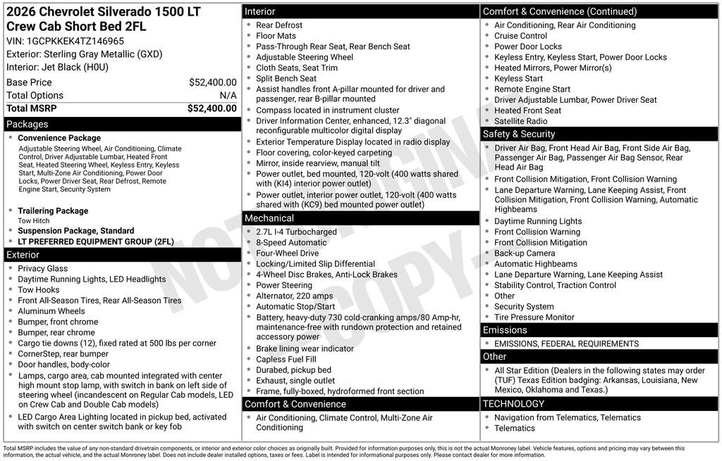 Sterling Gray Metallic 2026 Chevrolet Silverado 1500 LT 4WD 8-Speed Automatic 2.7L I4 Turbocharged DOHC 16V LEV3-SULEV30 310hp 8-Speed Automatic, 4WD, Black Cloth.