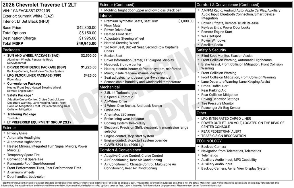 Summit White 2026 Chevrolet Traverse LT 2LT AWD 8-Speed Automatic 2.5L DOHC AWD.Recent Arrival!