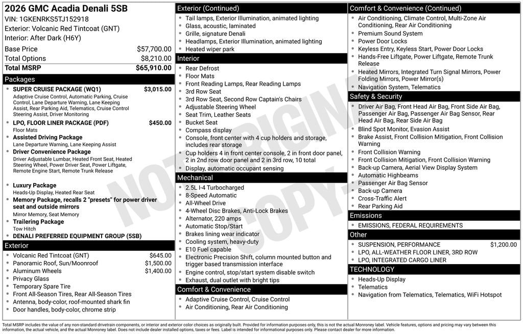 Volcanic Red Tintcoat 2026 GMC Acadia Denali AWD 8-Speed Automatic 2.5L DOHC AWD, After Dark Leather.