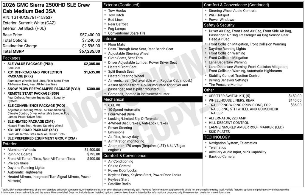 Summit White 2026 GMC Sierra 2500HD SLE 4WD 10-Speed Automatic 6.6L V8 10-Speed Automatic, 4WD, Jet Black Cloth.