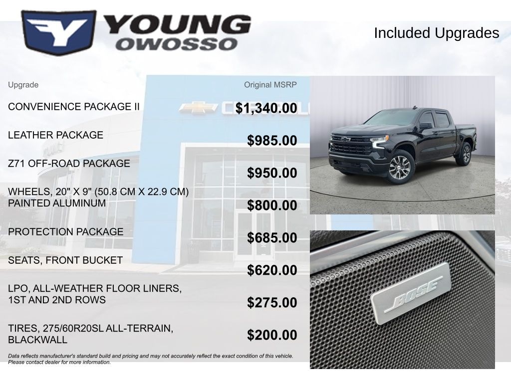 LOCAL TRADE!, Silverado 1500 RST, EcoTec3 5.3L V8, 4WD, Black Leather, 10-Way Power Driver Seat w/Lumbar, 12.3" Multicolor Reconfigurable Digital Display, 120-Volt Bed Mounted Power Outlet, 120-Volt Instrument Panel Power Outlet, 6-Speaker Audio System, All-Star Edition, Auto-Locking Rear Differential, Bluetooth® For Phone, Chevrolet Connected Access Capable, Chevytec Spray-On Black Bedliner, Color-Keyed Carpeting Floor Covering, Compass, Convenience Package, Convenience Package II, Deep-Tinted Glass, Dual Exhaust w/Polished Outlets, Dual Rear USB Ports (Charge Only), Dual-Zone Automatic Climate Control, Electric Rear-Window Defogger, Electrical Steering Column Lock, Electronic Cruise Control, EZ Lift Power Lock & Release Tailgate, Front Frame-Mounted Black Recovery Hooks, Front LED Fog Lamps, Front Rubberized Vinyl Floor Mats, HD Rear Vision Camera, Heated Driver & Front Outboard Passenger Seats, Heated Power-Adjustable Outside Mirrors, Heated Steering Wheel, Heavy-Duty Air Filter, High Gloss Black Mirror Caps, Hill Descent Control, Hitch Guidance, Hitch Guidance w/Hitch View, Inside Rear-View Mirror w/Tilt, Integrated Trailer Brake Controller, Keyless Open & Start, Leather Package, Leather Wrapped Steering Wheel, Leather-Appointed Front Seat Trim, LED Cargo Area Lighting, Manual Tilt/Telescoping Steering Column, Not Equipped w/Dynamic Fuel Management, Off-Road Suspension, OnStar & Chevrolet Connected Services Capable, Power Front Windows w/Driver Express Up/Down, Power Front Windows w/Passenger Express Down, Power Rear Windows w/Express Down, Power Sliding Rear Window w/Rear Defogger, Preferred Equipment Group 1SP, Premium Bose 7-Speaker Sound System, Protection Package, Rear 60/40 Folding Bench Seat (Folds Up), Rear Rubberized-Vinyl Floor Mats, Rear Wheelhouse Liners, Remote Vehicle Starter System, SiriusXM w/360L, Standard Suspension Package, Standard Tailgate, Steering Wheel Audio Controls, Theft Deterrent System (Unauthorized Entry), Trailering App, Trailering Package, Universal Home Remote, Up-Level Rear Seat w/Storage Package, Wi-Fi Hot Spot Capable, Wireless Phone Projection, Z71 Off-Road Package.