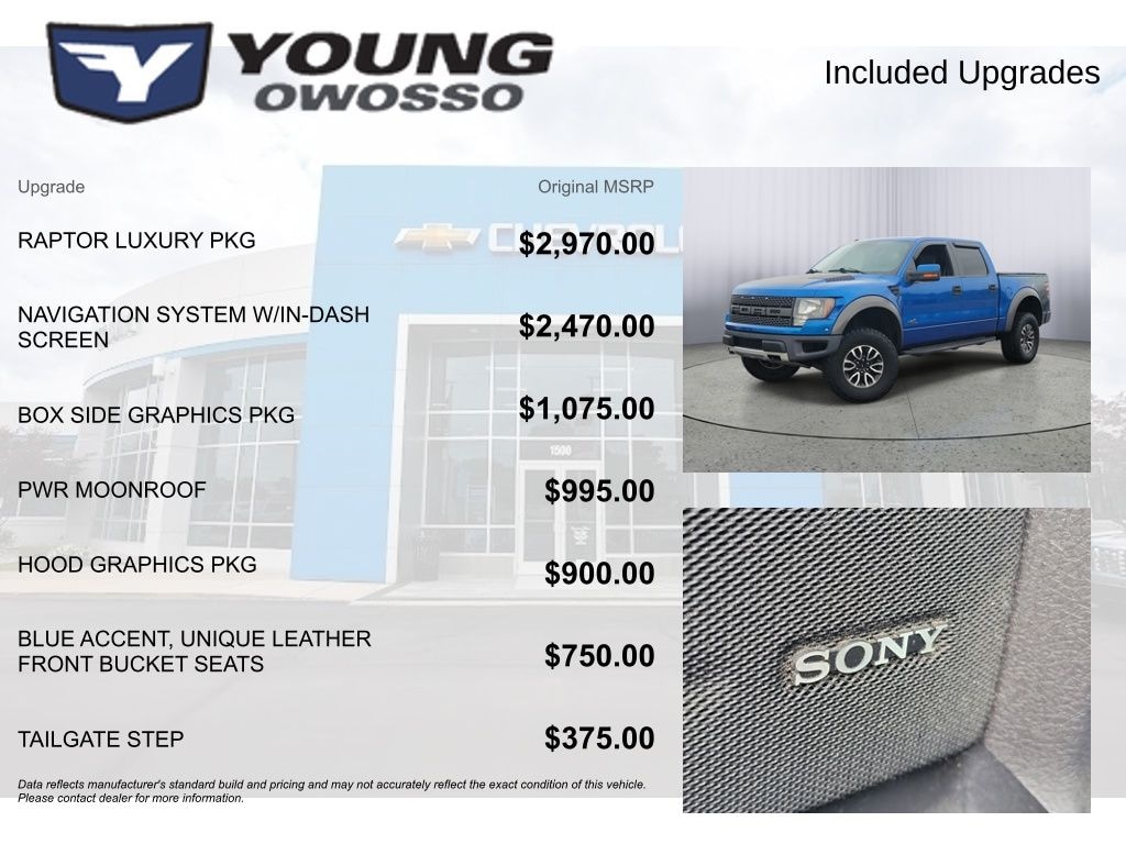 F-150 SVT Raptor, 4D SuperCrew, 6.2L V8 EFI 16V, 4WD, Blue Flame Metallic, 10-Way Power Adjustable Driver & Passenger Seat, Dual Electronic Automatic Temperature Control, GVWR: 7,300 lbs Payload Package, Heated PowerFold Sideview Mirrors, Heated/Cooled Driver & Passenger Seats, Hood Graphics Package, Memory System, Order Code 517A, Power Adjustable Pedals w/Memory, Radio: Sony Audio w/Multi CD, Raptor Luxury Package, Rear-View Camera, Remote Start, Trailer Brake Controller, Universal Garage Door Opener.