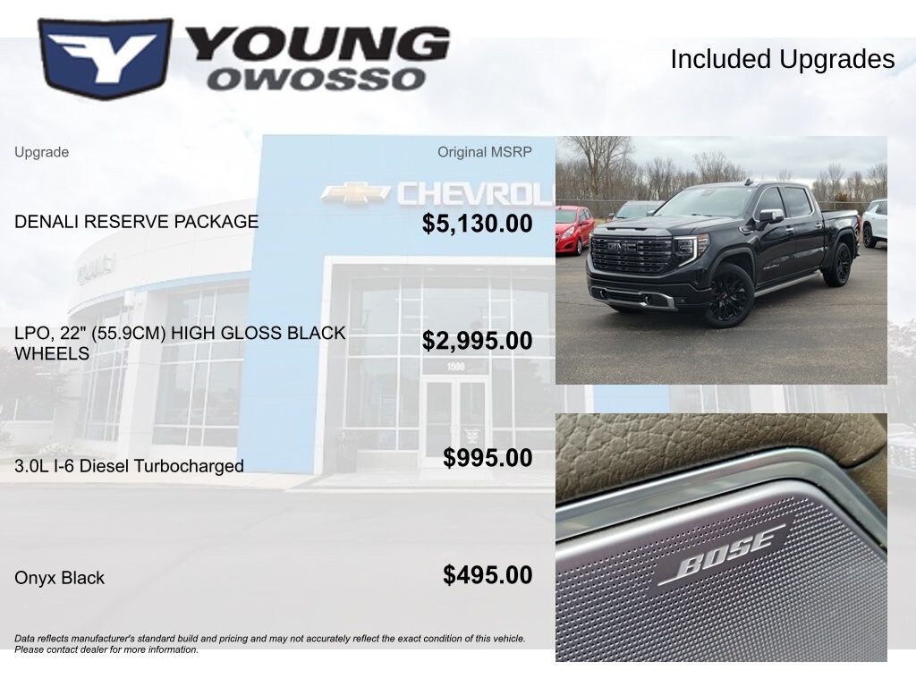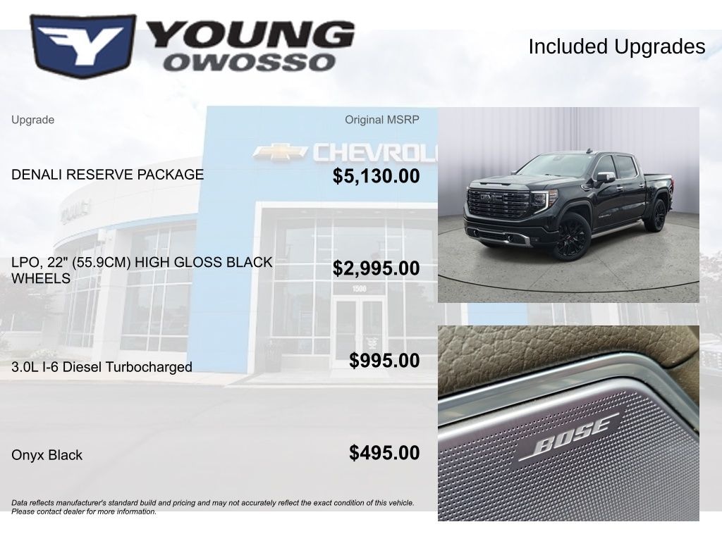 LOCAL TRADE!, Sierra 1500 Denali, 4D Crew Cab, 3.0L I6, 4WD, 120-Volt Bed Mounted Power Outlet, 120-Volt Instrument Panel Power Outlet, 170 Amp Alternator, 2 Charge/Data USB Ports Inside Center Console, 2 Type-C Charge-Only Rear USB Ports, 2 USB Ports, Adaptive Cruise Control, Auto-Locking Rear Differential, Automatic Emergency Braking, Auxiliary External Transmission Oil Cooler, Bed View Camera, Chrome Header w/Signature Denali Chrome Grille, Chrome Recovery Hooks, Chrome Wheel To Wheel Assist Steps, Color-Keyed Carpeting Floor Covering, Compass, Deep-Tinted Glass, Denali Reserve Package, Electric Rear-Window Defogger, Electrical Steering Column Lock, Floor-Mounted Center Console, Front Rainsensing Wipers, GMC Connected Access Capable, GMC MultiPro Power Steps, HD Surround Vision, Heated 2nd Row Outboard Seats, Heated Driver & Front Outboard Passenger Seating, Heated Steering Wheel, Heavy-Duty Air Filter, Hill Descent Control, Hitch Guidance, Hitch Guidance w/Hitch View, In-Vehicle Trailering App, Integrated Trailer Brake Controller, Keyless Open & Start, LED Cargo Area Lighting, Multicolor 15" Diagonal Head-Up Display, OnStar & GMC Connected Services Capable, Perimeter Lighting, Power Door Locks, Power Front Passenger Windows w/Express Up/Down, Power Front Windows w/Driver Express Up/Down, Power Rake & Telescoping Steering Column, Power Rear Windows w/Express Down, Power Sliding Rear Window w/Rear Defogger, Power Sunroof, Preferred Equipment Group 5SA, Premium Bose 7-Speaker Sound System, Push Button Start, Rear Camera Mirror, Rear Cross Traffic Braking, Rear Pedestrian Detection, Rear Wheelhouse Liners, Remote Vehicle Starter System, SiriusXM w/360L, Spray-On Pickup Bed Liner w/Denali Logo, Steering Wheel Audio Controls, Technology Package, Theft Deterrent System (Unauthorized Entry), Trailer Camera Provisions, Trailer Side Blind Zone Alert, Trailering Package, Ultrasonic Front & Rear Park Assist, Universal Home Remote, Ventilated Driver & Front Passenger Seats, Wheel Locks (Set of 4) (LPO), Wheels: 22" x 9" Painted Aluminum, Wi-Fi Hotspot Capable, Wireless Charging, Wireless Phone Projection.