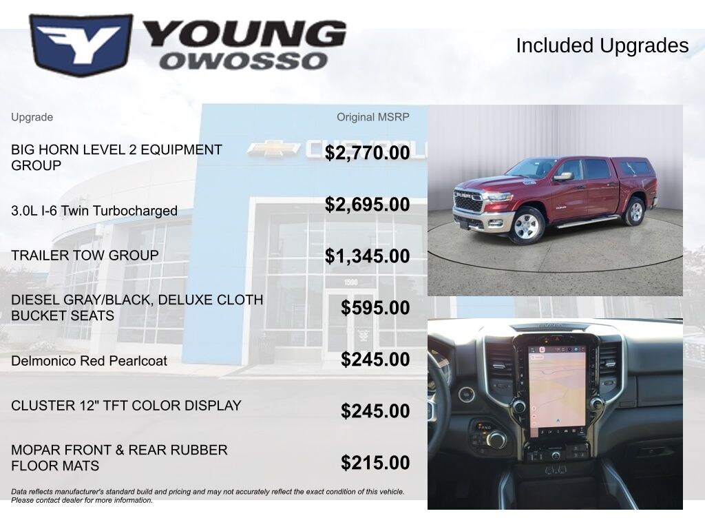 LOCAL TRADE!, 1500 Big Horn/Lone Star, 3.0L I6, 4WD, 115V Auxiliary Power Outlet, 115V Auxiliary Rear Power Outlet, 12" Touchscreen Display, 2nd Row In Floor Storage Bins, 400W Inverter, 4G LTE Wi-Fi Hot Spot, 9 Amplified Speakers w/Subwoofer, Accent Color Tailgate Handle, Air Conditioning ATC w/Dual Zone Control, Apple CarPlay, Auto Power-Folding Mirrors, Auto-Dimming Exterior Driver Mirror, Auto-Dimming Rear-View Mirror, Big Horn Level 2 Equipment Group, Black Exterior Mirrors, Black Premium Power Mirrors, Black Trailer Tow Power Mirrors, Cluster 7.0" TFT Color Display, Configurable Drive Mode, Connected Travel & Traffic Services, Connectivity - US/Canada, Convex Wide-Angle Exterior Mirror Insert, Exterior Mirrors Courtesy Lamps, Exterior Mirrors w/Heating Element, Exterior Mirrors w/Supplemental Signals, Glove Box Lamp, Google Android Auto, GPS Antenna Input, GPS Navigation, HD Radio, Heated Front Seats, Heated Steering Wheel, Integrated Voice Command w/Bluetooth, Leather Wrapped Steering Wheel, LED Dome Lamp w/On/Off Switch, LED Footwell Lighting, Manual Folding Exterior Mirrors, Manual Telescoping Mirrors, Media Hub w/2 Charge Only USBs, Mirror Clearance/Running Lights, Overhead LED Lamps, Power 2-Way Driver Lumbar Adjust, Power Adjust 8-Way Driver Seat, Power Adjustable Pedals, Power-Adjustable Convex Aux Mirrors, Premium Overhead Console, Quick Order Package 21Z Big Horn, Radio: Uconnect 5 Nav w/12.0" Display, Rear Power Sliding Window, Rear Window Defroster, Remote Tailgate Release, Security Alarm, SiriusXM w/360L, Steering Wheel Mounted Audio Controls, Sun Visors w/Illuminated Vanity Mirrors, Trailer Brake Control, Trailer Reverse Steering Control, Trailer Tire Pressure Monitoring System, Trailer Tow Group, Trailer Tow Mirrors, Universal Garage Door Opener, USB Host Flip.